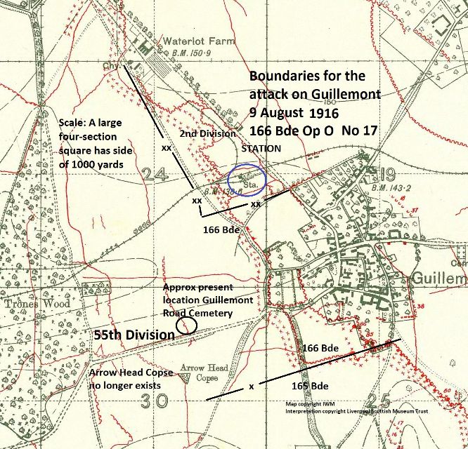 Not ‘all’ battalions arrived on time. 166 Brigade attacked at 4:20 am with, on the right, the 1/10 KLR south of the Trônes Wood – Guillemont road, followed by 1/5th South Lancs [1/5 SLR]. The 1/5 LNLR were supposed to be on their left, north of the road. In 1/10 KLR.