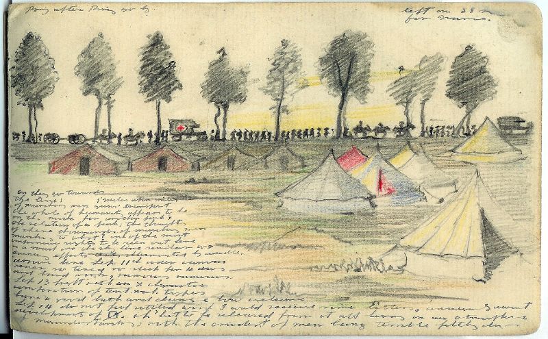 9/8/16: Attacked …short but terribly intense bombardment … hundreds of guns. Attack failed. [Three attempts] to take German trench but men mown down by MGs. Colonel wounded… Many friends … killed or missing. Busy time for SBs. Completely exhausted after severe and ghastly work. Buried for a short time but got out …. Spent what seemed endless time in a shell-hole with two wounded. Escape seemed impossible … machine gun was ranged on the spot but eventually … I got out with one of the men … and half-dragged him to where … some tin hats were moving. It [was] a sunken road … distance was not more than 50 yards, it seemed to be miles …being all the time fired on. [When] darkness fell, not so dark really with the hundreds of Very Lights, all SBs went out to bring in wounded and dead. … during night-search we took what cover we could from shrapnel and machine guns - only one casualty among SBs - the Doctor- who got a piece of shrapnel in his thigh. [Herd Diary]