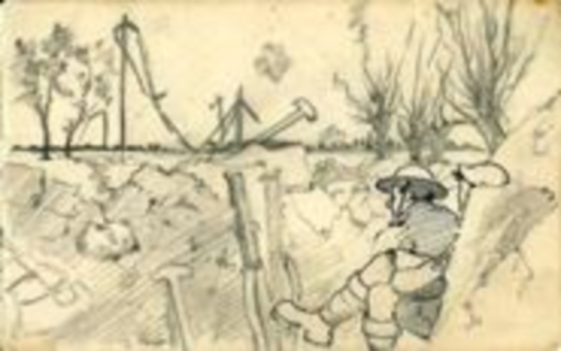 Private William Henry Campbell was a volunteer. He served with the Liverpool Scottish on the Somme and in the Ypres Salient from July 1916 until he was killed in action at the age of 25 on 31 July 1917, the first day of the Passchendaele campaign, at the Battle of Pilckem Ridge. It was in this battle that the battalion’s Medical Officer, the double VC winner Captain Noel Chavasse was mortally wounded. Campbell was a ‘house painter and decorator’ by trade; he had attended art school. Over a year, he recorded his thoughts and observations both in miniscule handwriting and vivid drawing using crayon or pencil, often actually in the front line. A man removing lice from his kilt, men around an ornate stove in a rear area, different types of shell burst seen from 300 yards or simply the contrasting landscapes of war, either thronged or empty of men, are all subjects found in the book, often with haunting footnotes. After a century and for the first time, nearly thirty images from this unique survival, an important historical document, have been selected for display. They are reproduced on watercolour paper and accompanied by interpretation of the text. Additionally, about 7000 words of the diary have been transcribed and, accompanied by almost all his illustrations in colour, have been included in a substantial booklet. The diary is not an easy read: Campbell often seems highly depressed, suffering sharp mood swings and often has difficulty in coping with the range of personalities and social backgrounds he encounters amidst the stress of war. At other times he is highly positive. However, although his account is atypical in its intensity, he deserves to be heard and his art, often drawn in a dripping dugout by the light of a candle shaken by gunfire, deserves to be seen.