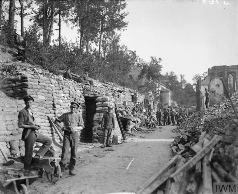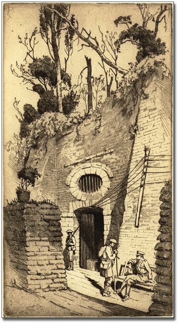 These ramparts billets merit special description. The city of Ypres is guarded on the east by a rampart and moat – this rampart being about 50 feet high and of equal thickness and formed of the earth taken out when the moat was dug and faced with brick …. Under this [casemates] had been excavated – stuffy, cramped places filled with frames and props, dimly lit by electric light and generally overcrowded and always damp and rat infested – but places where the … reserve could lie down and sleep in comparative safety except for the danger of gas.