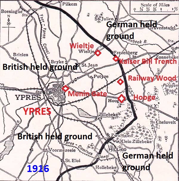Front line spells varied but were often only four days but longer (two or three weeks) during major summer offensives. Infantry probably spent about 25% of their time in the front line but in difficult conditions, especially in winter. Directly east of Ypres and just north of the Menin Road was Railway Wood. The 55th Division held up to 5000 metres (alternating with other divisions) running north from Hooge on the Menin Road through Railway Wood to Wieltje. The anonymous veteran of 1/4 LNLR wrote: