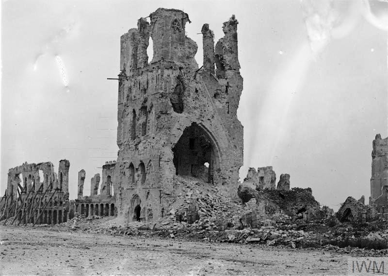Belgium’s ancient moated and walled city of Ypres (Ieper in Flemish) is the centre of a semicircle of low hills a few miles to its east. Whilst the hills may be low, they command the city set in the otherwise flat Flanders countryside. The front approximated to the crest of these hills so that the British line jutted into German-held territory. This bulge was the infamous ‘Ypres Salient’ or simply ‘The Salient’. The Germans looked down and could fire from three sides onto Ypres. The Salient was a place more dangerous than most. The famous Cloth Hall of Ypres (the cathedral-like wool trading hall, finished 1304) was progressively demolished leaving the great tower just a stump; it took until 1967 to restore.