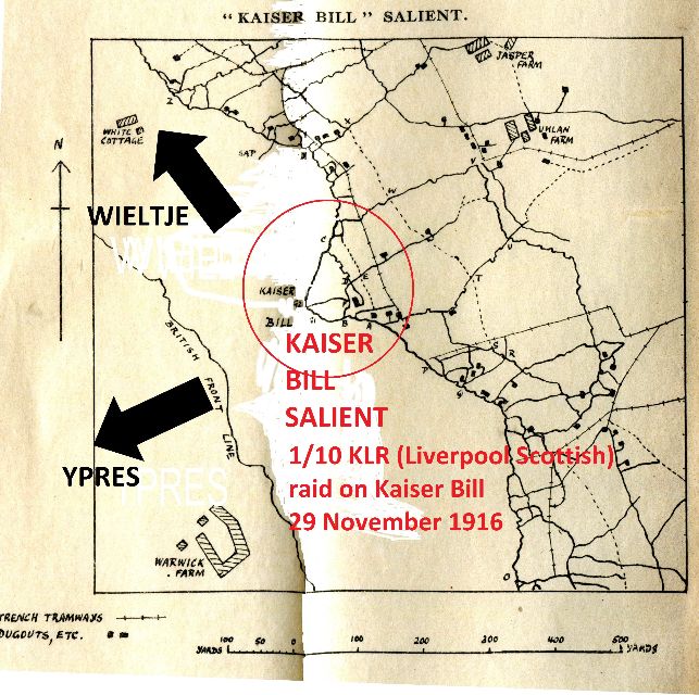 Carefully prepared raids carried fighting to the enemy. Parties up to 200 caused mayhem, took prisoners and eroded enemy morale. 1/10 KLR raided ‘Kaiser Bill’ trench (Wieltje) in November 1916. Equipment and roles were detailed for all 86 men. Three weeks’ work brought success but training was so realistic that one man was killed and 11 wounded when a bomb exploded prematurely.