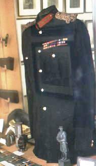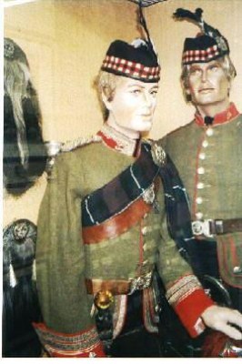 On the left of the picture is the uniform of Colonel Forbes Bell VD (Volunteer Decoration) and on the right is a private soldier also of the period immediately after 1900. Silver lace (on the scarlet collar and cuffs) and silver shoulder cords are seen, indicating the volunteer status of the unit; officers of the regular Army would have had gold cords and lace. Colonel Forbes Bell's field rank (major, lieutenant colonel or colonel) is indicated not only by badges of rank on the shoulder cords but also by the lace rings on his cuffs. Head dress is a glengarry with a blackcock plume. Feather bonnets were also worn on occasion. The amber object seen to be worn at the right hip is a cairngorm(a semi-pre ious stone) which forms the pommel of his dirk (a large hunting knife with a blade etched with the decorative motifs and the regimental title of the Liverpool Scottish). The scabbard of the dirk houses a small knife and fork in separate compartments. His left hand rests on the nickel-plated basket hilt of his broadsword, the blades of many of which were finely etched with regimental titles and decorative foliage. In some regiments the blades would be etched with the name of the officer for whom the weapon was made. On the left two Liverpool Scottish goathair sporrans with silver cantle (top) and two silver bells with black tassels can be seen.