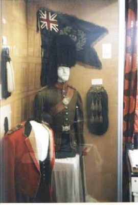 This case contains the full dress tunic of Captain RFB Dickinson with feather bonnet. Captain Dickinson was killed in the charge at Hooge in June 1915, leading X Company, and was one of three brothers who served in The Liverpool Scottish during the Great War of whom only one survived. By the left arm of the uniform (the viewer's right) can be seen the broadsword with a cross-hilt rather than a basket hilt. The cross-hilt was fitted for active service, replacing the larger basket hilt which was ill-matched for wear with the Sam Browne belt from which it would be suspended by a sword 'frog'. The uniform in the foreground is an officer's scarlet mess kit jacket of The Queen's Own Cameron Highlanders with gold rank shoulder cords. The pattern used by officers of the Liverpool Scottish is similar except that it has black shawl collar edged with white piping. Behind the head of the model is a blue silk pipe banner. This would be suspended from the largest drone of a set of pipes and carried on ceremonial occasions or when pipes are played in the messes. In this case the reverse side is showing although for this pattern of banner both sides are identical. The pattern is that of the79th Cameron Highlanders which from 1841 to 1873 used in green silk but thereafter, having become a Royal regiment, the green silk was replaced with blue. The pattern continued being used by the 1st Battalion, The Queen's Own Cameron Highlanders until amalgamation with the Seaforths in 1961. The centre is embroidered with wreath of thistles and the number LXXIX. Officers' personal arms, crests or monograms were not used on these banners. The 2nd Battalion of The Queen's Own Cameron Highlanders, raised in 1897, carried similar blue fish-tailed banners with a central design similar to that at the centre of a Cameron regimental Colour but with the Union flag appearing only on the obverse side. The banners of the 2nd Battalion were personal to officers and carried their crest, monogram or company letter embroidered on the reverse.The Liverpool Scottish set of pipe banners, an example of which is illustrated elsewhere, was presented by individuals at the time that the Liverpool Scottish became part of he Queen's Own Cameron Highlanders in 1937. They are similar to the 2nd Battalion pattern but without the Union flag. The monograms of those who presented banners are embroidered on a small raised shield in blue silk.