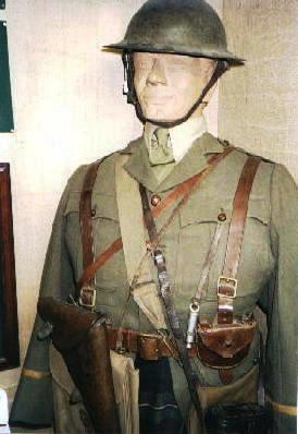 This is the standard uniform of a subaltern officer (a lieutenant or second lieutenant); he would have bought his own uniform which would be tailored for him. The rings of braid on the cuffs denoting rank can just be seen and one or two rank stars (known colloquially as 'pips') would also be worn on the cuffs. The pockets, secured with leather-covered buttons, were generally 'bellows pockets' cut with a fold in the cloth to allow for expansion as they filled up with the thousand and one bits and pieces any soldier or officer would carry for comfort or survival. The equipment belt is made of leather and is not the standard Sam Browne belt with a single cross-strap. From this belt would be suspended a revolver holster and amongst other impedimenta perhaps a map case, a compass case and a respirator (gas mask) . Gas had been used early in 1915 by the Germans against the French and the Canadians. A whistle hangs from his left breast pocket. Steel helmets did not become general until 1916 and, at the outset of the Great War, the Liverpool Scottish (together with many other kilted regiments) had worn the glengarry which was replaced gradually amongst the soldiers by the khaki 'balmoral' or 'Tam o'Shanter' (TOS), a change which was complete by early 1916. This officer and his men would have worn a kilt of the Forbes tartan, the only concession on the front line being that it may have been covered by a kilt apron of khaki or brown cloth worn over the front of the kilt. In wet and cold weather the edge of the kilt could freeze and would have a cutting action against the legs. On the feet, soldiers wore boots with puttees (wrap-round cloth strips that secured the top of the boot and gave protection to the leg). When the Liverpool Scottish first moved to France in 1914, soldiers were wearing civilian shoes with gaiters (spats) which proved no defence against mud and water. Boots and puttees did not become available until 1915. The medical officer, Noel Chavasse, fought a long battle against the effects of Trench Foot amongst the soldiers and developed strategies such as rubbing feet with spirits (though the use of their rum ration for this purpose was not popular) and ensuring that there were plenty of changes of socks. It was some time before the preventative measures he used became standard practice throughout the Army.