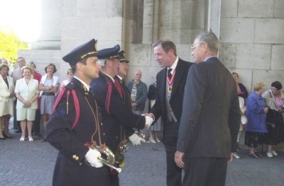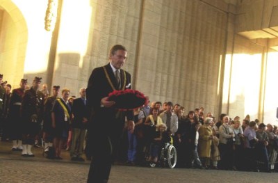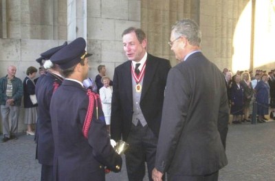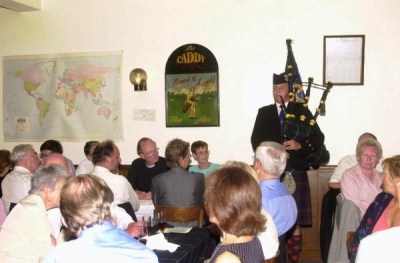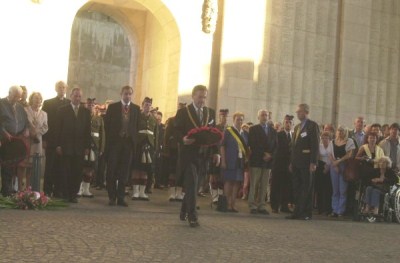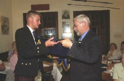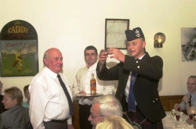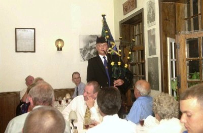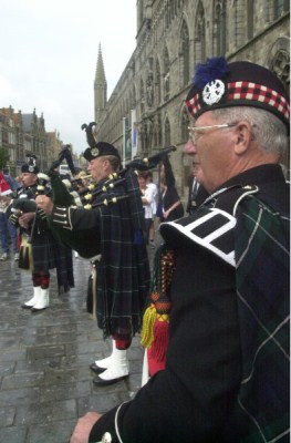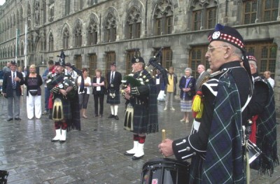 The Liverpool Scottish Officers' Association (President: Captain Edgar Chavasse, Chairman: Major David Evans TD) and friends held its dinner at 'The Trompet', a restaurant almost immediately beside the Stadhuis (Town Hall) in the Grot Markt in Ieper. The guests were the Lord Mayor and Lady Mayoress of Liverpool, the High Sheriff of Merseyside, the Rector of Liverpool, the Deputy Burgemeester of Ieper and Mrs Lignel, Major and Mrs Tony Swift, Mr and Mrs Piet Chielens and Mr Fernand Vanrobaeys and Ms Rose Wildermeersch. Piper Richard Grisdale (courtesy of the Commanding Officer of the 1st Battalion. The Highlanders , who had previously served in Liverpool Scottish, played after dinner and Captain Edgar Chavasse and Piper Grisdale presented the Ieper pipe banner to the town on behalf of the Liverpool Scottish.
