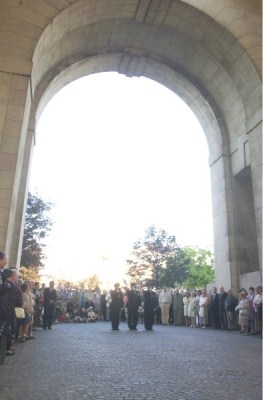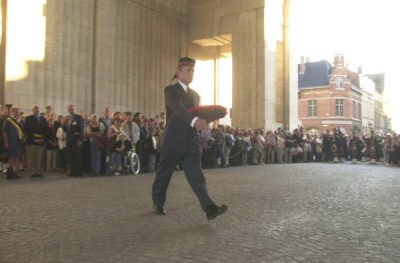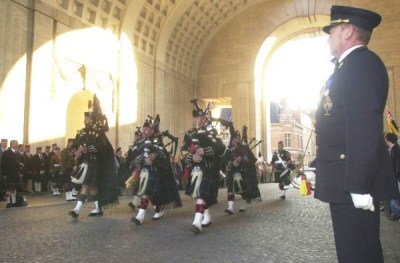 The Liverpool Scottish serving element of the King's and Cheshire Regiment marched a short distance to the Menin Gate with the Old Comrades and the standard of the Liverpool Scottish Regimental Association. They were joined by the standard party of the Hounslow Royal British Legion. The main party from Hounslow RBL was already paraded at the Gate. After the Last Post, the lament, 'Flowers of the Forest' was played by Piper Grisdale. which can be heard by clicking the link provided.He carried the Ieper pipe banner which was to be presented to the town by the Liverpool Scottish later that evening.
