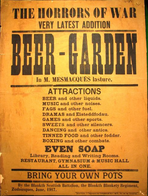 In the middle of digging the actual trenches, entertainment for the battalion was provided through the efforts of CQMS RA Scott Macfie (with financial support from his CO and the MO, Captain Noel Chavasse) in a highly successful ‘Beer Garden’, described as ‘Library, Reading, and Writing rooms, Restaurant, Gymnasium and Music Hall all in one’ and where Macfie proposed to hold a rather less-than Welsh ‘Eisteddfod’. Macfie was a man who provided what he promised and the Beer Garden ran for some time in the rear area.