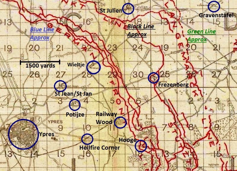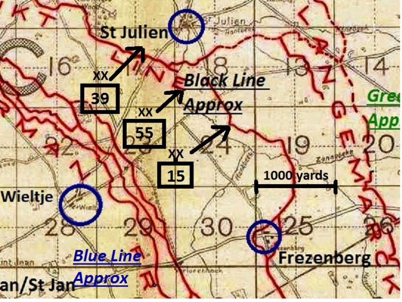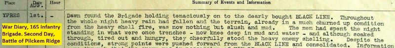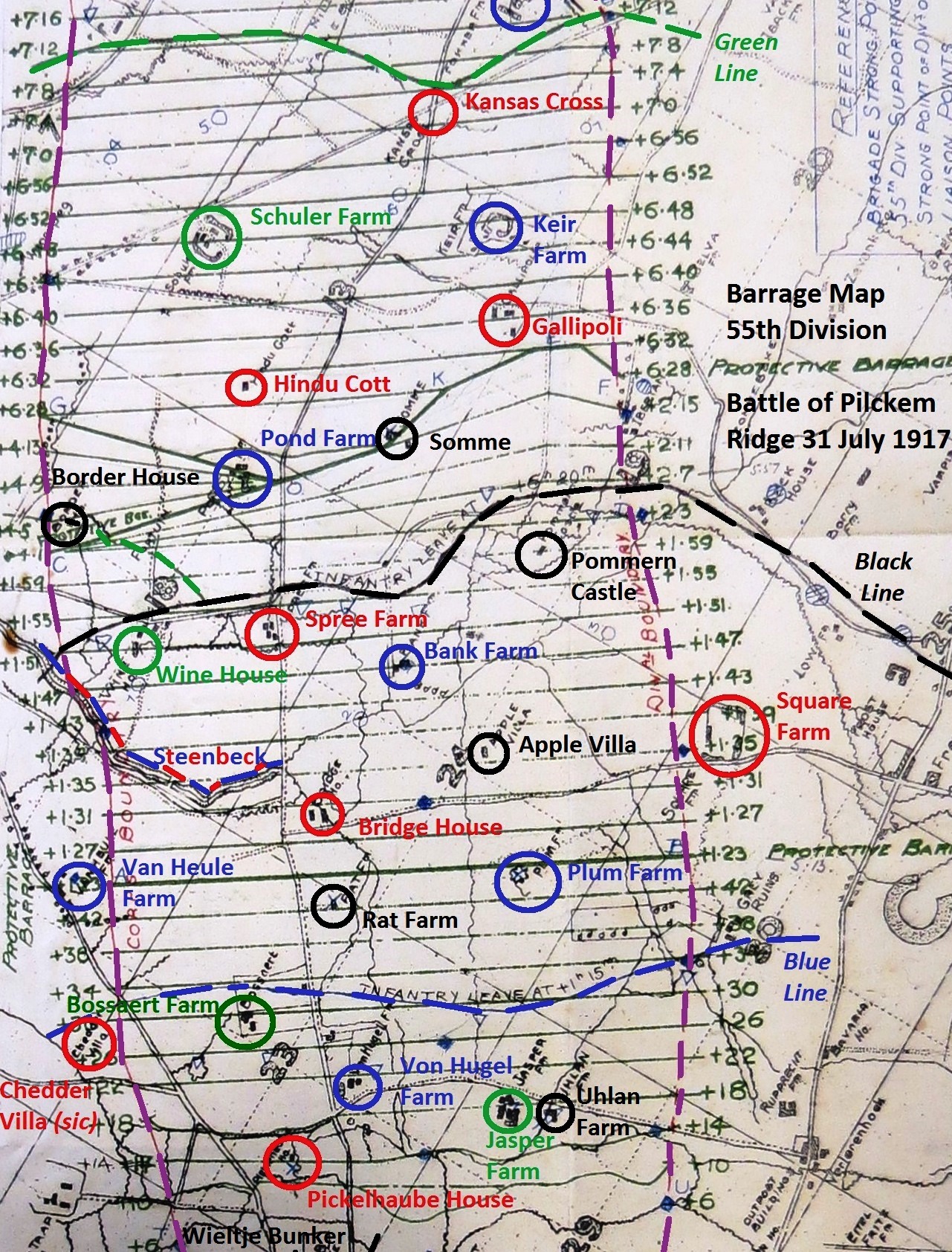 The 55th Division assaulted on the first day, 31 July, with two brigades (165 and 166) attacking first, the leading two battalions of each brigade advanced 1000 yards to take the first objective (known as the Blue Line – essentially just beyond the triple-trench system that up the German front line) and then the other two battalions of each brigade passed through to capture the second objective, the Black Line, which was the German second-line a further 1000 yards on, known as the Stutzpunkt line. The Blue Line was quite easily captured but fighting for the Black Line was much more intense with flexible tactics from the Germans prepared to leave prepared bunkers and set up machine gun posts in shell-holes that were much more difficult to spot.