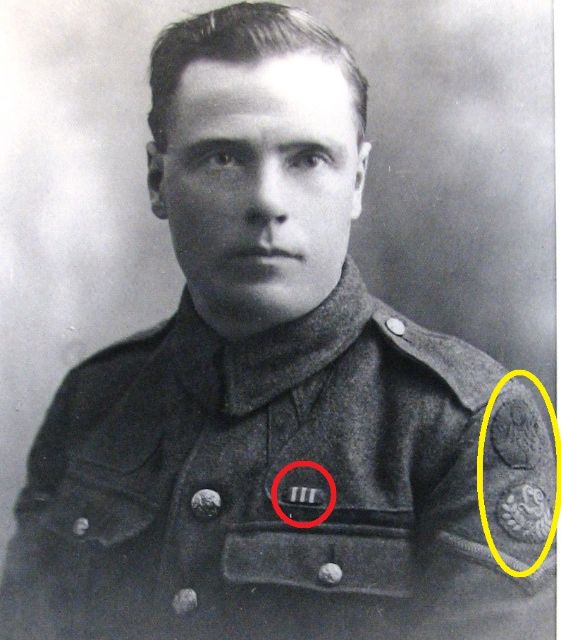 The photo to the left shows a Lance-Corporal of the 55th (West Lancashire) Division, his divisional 'Red Rose' insignia (so after the middle of 1917) and his 'Lewis Gunner' specialist badge in the yellow oval and the ribbon of the Military Medal in the red circle. It did much to make the infantry platoon independent of other support (Liverpool Scottish Museum Trust).