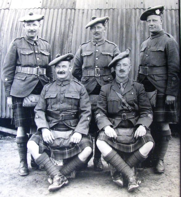 To the right are Warrant Officers of the Liverpool Scottish (1/10KLR) at Poperinghe, 7 miles to the rear of Ypres (Ieper) 1917. Back (l to r) CSM MacDonald (a volunteer since 1903, KIA September 1917), CSM Amos (to win the Distinguished Conduct Medal when he took command of his company, all officers being casualties), CSM Marples (two wound stripes on his sleeve and to win the Military Cross securing the left flank of the Division). Front (l to r) RQMS Stoddart (sitting on a box marked 'Government Explosives', a volunteer since before 1901, died of wounds August 1917), RSM Jennings (originally permanent staff with 18 years service with the Gordon Highlanders) (Liverpool Scottish Museum Trust).