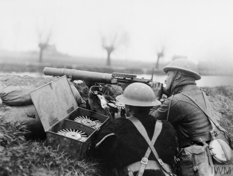 The Lewis Gun was carried by a single man but it was served by a section of nearly ten men (most armed with rifles) to carry ammunition and control fire It weighed 28 lb (13 kg), had magazines holding 47 rounds and an effective range of 880 yards (approx. 800 m) with a rate of fire of 500/600 rounds per minute. This, and the other specialised sections of the infantry platoon, gave its commander much more flexibility and allowed the platoon to tackle enemy pillboxes and other emplacements.