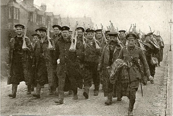 In October, reservist sailors of the RNVR had briefly deployed to Belgium as infantry, virtually untrained, with a Royal Naval Division to defend Antwerp. From North-Western England, the Liverpool Scottish and the 1/6th Bn, The Cheshire Regiment from Stockport landed in France in November 1914. The Liverpool Scottish had mobilized to Edinburgh under canvas.