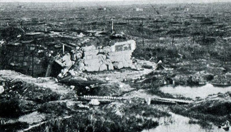 The country traversed was in an indescribable condition. Heavy fighting had been continuously in progress for weeks past on this front – the ground had been so ploughed up by shells that distinguishing marks had been almost completely eliminated. A ribbon of mud-soaked, shell-pitted road ran eastwards ... but on either side the country was a veritable honeycomb of shell-holes for as far as the eye could reach, the only [way forward] being by taking a winding course round the lips of the craters