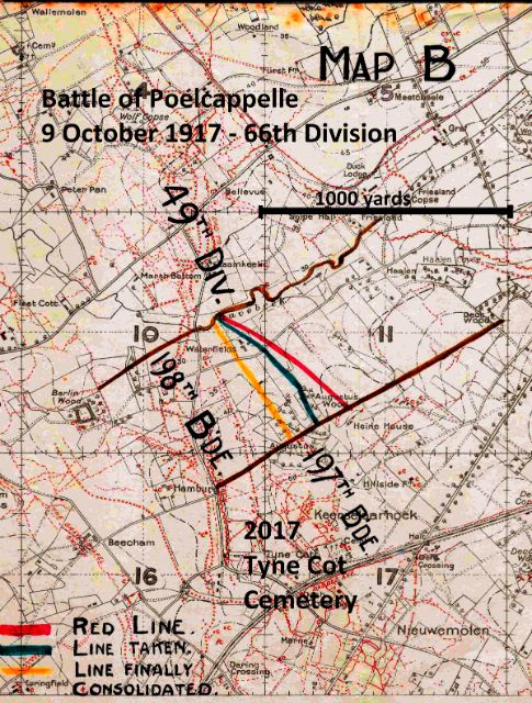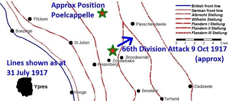After moving south, the 66th Division joined the Battle of Poelcappelle on 9th October on the right flank of II ANZAC Corps, attacking north-east with their objective 700 yards short of Passchendaele village. Roger Goodwin of the Lancashire Infantry Museum (Fulwood Barracks, Preston) told the story in the Lancashire Post (6 Oct 2017); what follows is abbreviated. The 66th Division were actually fighting near what is now Tyne Cot Cemetery, some 4 miles south-east of Poelcappelle village. The ELR’s history relates the difficulties: