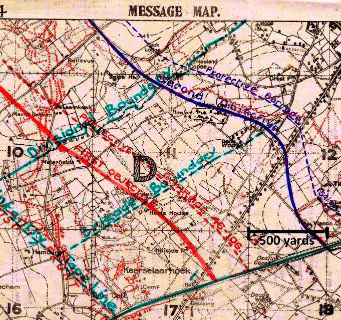 198th Brigade (Manchesters and ELR) began moving forward early the previous day, spending the afternoon stationary with cover from neither rain nor shellfire. Their final night approach was about 2 miles through glutinous mud that took around 12 hours or more. Two battalions failed to reach the start line by Zero Hour (5.20 am), the last arriving only by 7 am. Behind an inadequate creeping barrage, they attacked defences, relatively undamaged by artillery, to be held up just short of their first objective (see map). George Crawshaw, an old boy of Bury Grammar School and medical officer of 2/5th ELR, won the MC for his gallantry in tending the wounded.