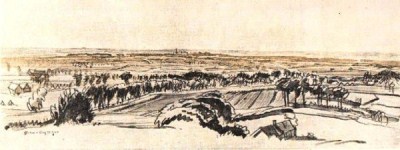 Much of this early period was spent near Ieper (Ypres) and a lithograph by Sir Muirhead Bone of the area between Kemmel and Ieper is shown here. It was published in 1916 but gives a good idea of the open nature of the country.