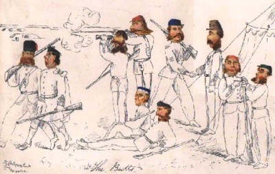 The 'Liverpool Scottish Rifle Volunteers (XIXth Lancashire)' were raised in 1859. The cards (not showing the Liverpool Scottish but the other rifle volunteers unit) below bear the imprint of 'J.C. Dollman Junior of Hove, Brighton'. The coloured heads have been cut out from card and the facial features are rendered in high quality print with a certain amount of embossed relief. They presumably represent volunteer life in sunnier and more southern climes than Liverpool. The interest is in the reflection they give of the perception of the Volunteer Movement at the time. It seems to be perceived as a pleasant and convivial activity of gentlemen discharging their duty as citizens as well as their rifles (occasionally). However, it is certain that the citizens of Liverpool took their military duties in 1860 seriously enough to establish rifle ranges at Altcar described as 'second only to those at Bisley. The detailed nature of the faces is of interest and it is possible that they are caricatures of local Brighton worthies or politicians of the time. Any information regarding their identity would be gladly received.