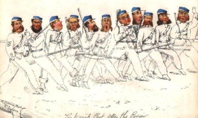 A rather more relaxed attitude seems in evidence. The Senior NCO on the left has his hand in his pocket, the man to his left apparently with a pipe, a yawn in the middle of the front rank and the left guide (on the viewer's right) is seemingly raising his glass to the artist as he passes. The step seems less than uniform and the rifles are being trailed at rather less than regimental angles. Territorial officers and NCOs of the subsequent 150 years might still occasionally identify with these problems.