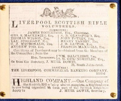 The highlanders then called their own meeting and resolved to form a new kilted Highland Company. Which was to be accepted to the 71st Lancashire Rifle Volunteer Corps (1st Liverpool Highland Company), with Captain John Scott comanding. Dress was to be a fawn grey kilt and tunic, with blue facings, and Dunkeld bonnet.