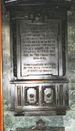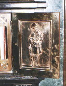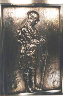 Details of the doors are shown below in which a soldier fully-equipped for the front line is seen resting with 'arms reversed' (the drill position to indicate mourning with the left foot slightly advanced, the head bowed and the rifle reversed with hands resting on the butt of the weapon). Almost identical figures are found on the wooden memorial from St. Andrew's Church of Scotland.