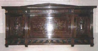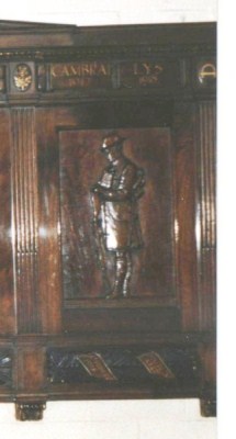 This memorial is finely carved from what appears to be mahogany in the form of a triptych with two soldiers resting on their arms (rifles) reversed in the posture of mourning in the outer panels and an inscription in the centre panel. Similar figures appear on the bronze memorial which was at the Regimental HQ in Fraser Street and subsequently moved to Forbes House in 1967. It is likely, therefore, that the designer for this memorial was also H. Tyson Smith especially in the light of the stylistic similarities of the lettering adn the pediment. The inscription is given below. Immediately below the pediment are the divisional badges of those divisions with which The Liverpool Scottish was associated. These are also seen in the painted frontispiece of the Roll of Honour.